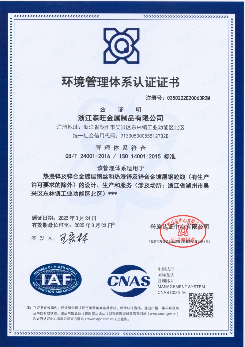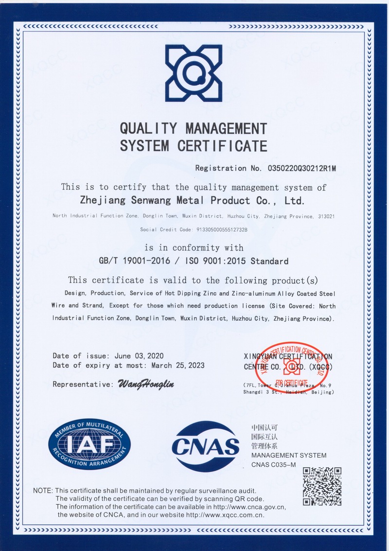 浙江森旺金屬制品有限公司成立于2012年,坐落湖州市吳興區(qū)東林鎮(zhèn)工業(yè)功能區(qū)。公司專業(yè)從事各類鍍鋅鋼絲、鋼絞線等產品的開發(fā)及生產。目前產品已廣泛應用于各類通信光電纜,電力輸送,電氣化鐵路工程,各類堤壩防護及農業(yè)溫室等工程領域。公司秉承“追求卓越品質,創(chuàng)建卓著信譽”的經營理念,始終堅持專業(yè)化、規(guī)模化的經營模式。